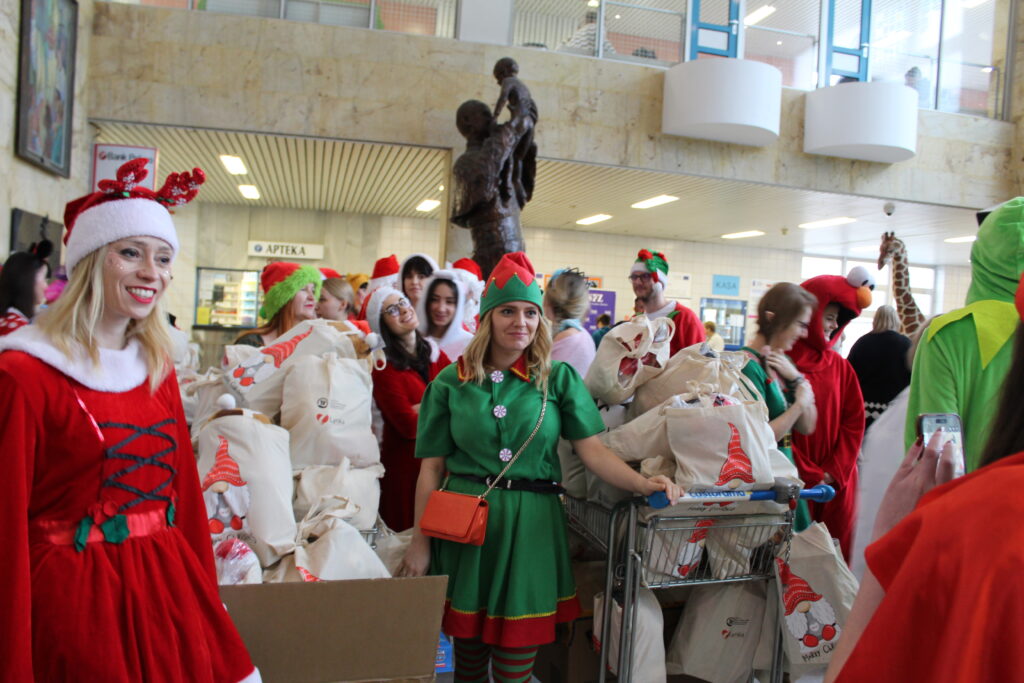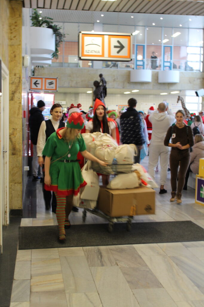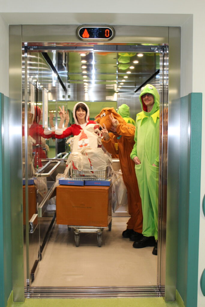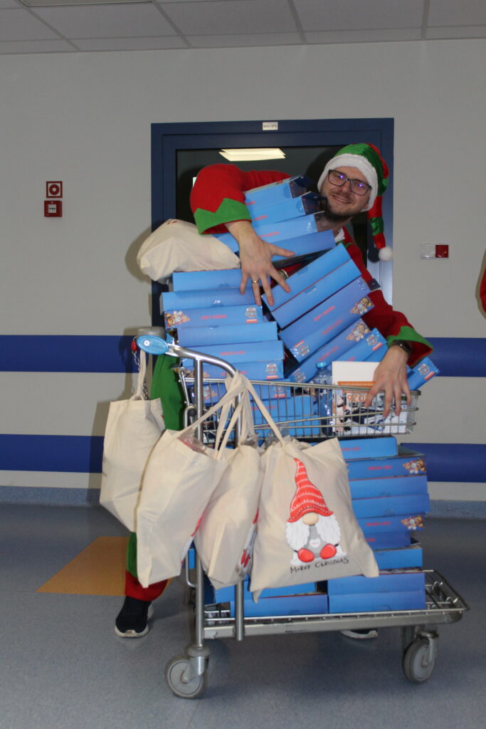 Od wczesnego ranka szpitalne korytarze tętniły niezwykłą energią. Wolontariusze współpracujący z Fundacją, podzieleni na kilka różnobarwnych orszaków, ruszyli w trasę po oddziałach szpitala, by dotrzeć do każdego hospitalizowanego dziecka. Z ogromnym zaangażowaniem i niekończącym się uśmiechem na twarzach wręczyli ponad 400 prezentów. Paczki były przygotowywane z wyjątkową starannością — zawierały zarówno artykuły zakupione przez Fundację, jak i podarowane przez życzliwych darczyńców, którzy z radością wsparli naszą inicjatywę. Dzięki temu każde dziecko otrzymało równie atrakcyjny i wartościowy upominek.