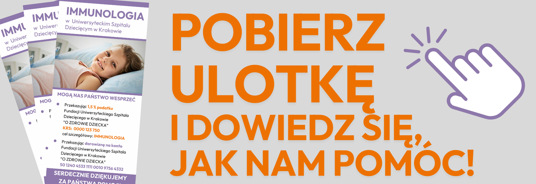 Przekazując do biura dokumenty niezbędne do rozliczenia nie zapomnij o podaniu informacji, iż 1,5% Twojego podatku powinien być przekazany Fundacji Uniwersyteckiego Szpitala Dziecięcego w Krakowie „O Zdrowie Dziecka” (konieczne jest podanie w formularzu PIT numeru KRS: 0000 123 750 i celu szczegółowego IMMUNOLOGIA).