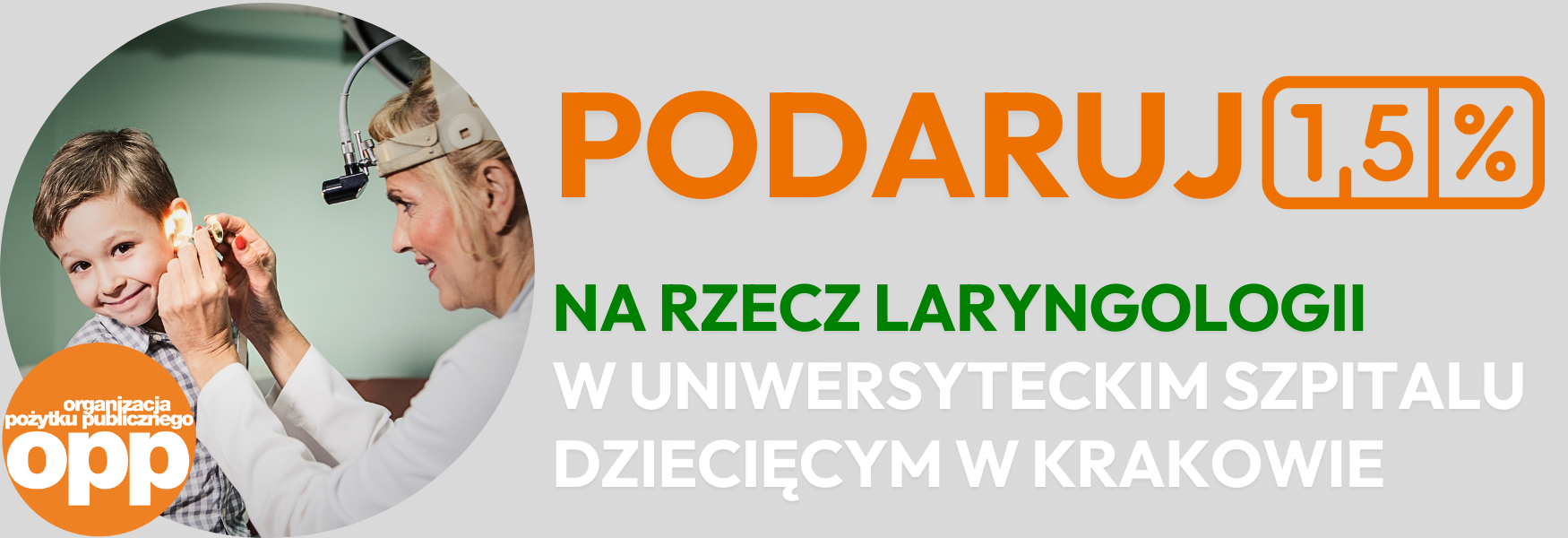 Przekazując naszej Fundacji 1,5% podatku na rzecz laryngologii wspierasz działalność następujących jednostek w Uniwersyteckim Szpitalu Dziecięcym w Krakowie: Oddział Laryngologiczny, Poradnia Laryngologiczna.