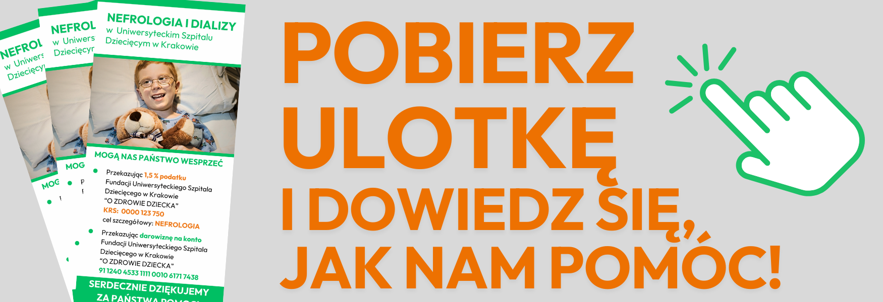 Przekazując do biura dokumenty niezbędne do rozliczenia nie zapomnij o podaniu informacji, iż 1,5% Twojego podatku powinien być przekazany Fundacji Uniwersyteckiego Szpitala Dziecięcego w Krakowie „O Zdrowie Dziecka” (konieczne jest podanie w formularzu PIT numeru KRS: 0000 123 750 i celu szczegółowego NEFROLOGIA).