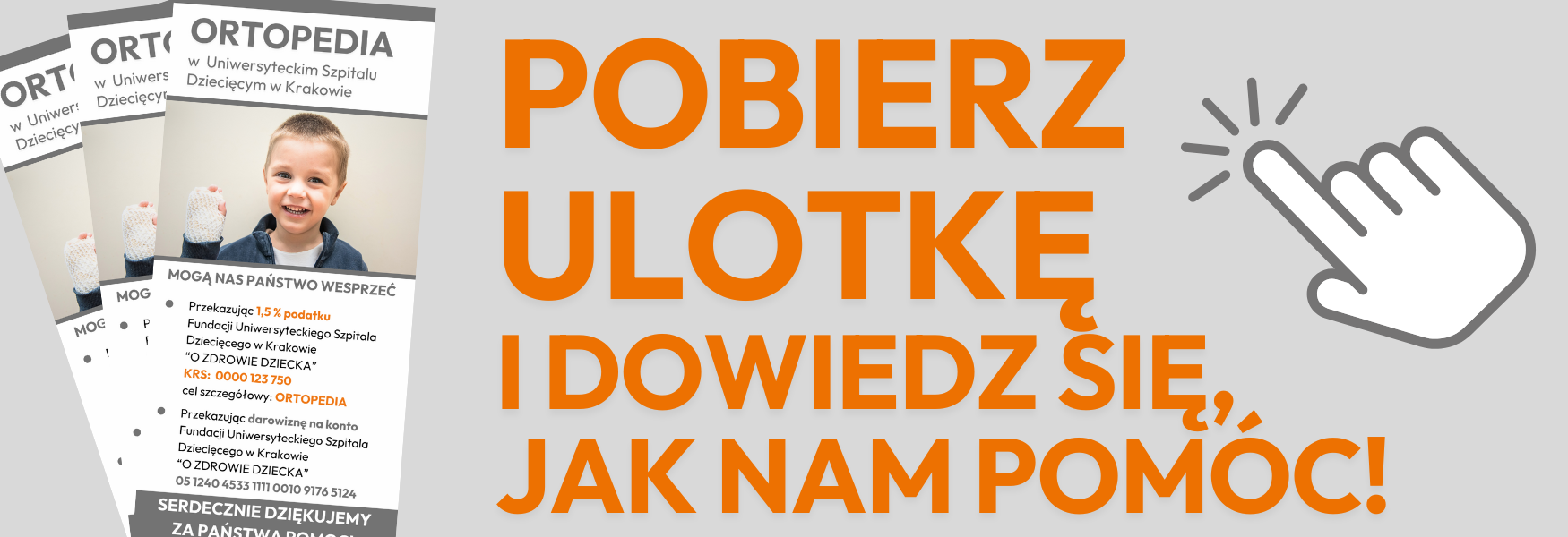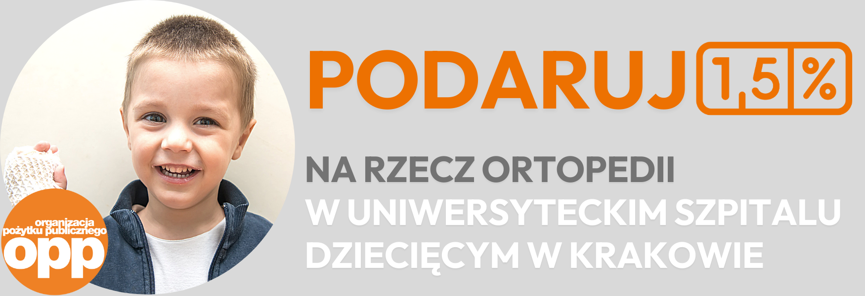 Przekazując naszej Fundacji 1,5% podatku na rzecz ortopedii wspierasz działalność następujących jednostek w Uniwersyteckim Szpitalu Dziecięcym w Krakowie: Oddział Ortopedyczno-Urazowy, Poradnia Ortopedii i Traumatologii Narządu Ruchu, Centrum Leczenia Artrogrypozy.