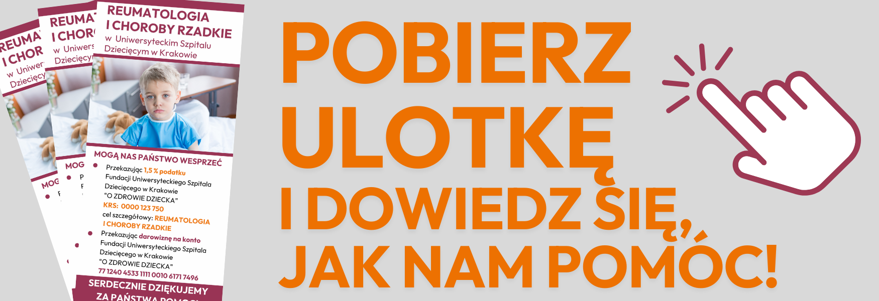 Aby przekazać 1,5% podatku Fundacji Uniwersyteckiego Szpitala Dziecięcego w Krakowie „O Zdrowie Dziecka” na rzecz reumatologii i leczenia chorób rzadkich w odpowiednim miejscu formularza wskazać naszą Fundację: podać numer KRS: 0000 123 750 oraz cel szczegółowy: REUMATOLOGIA I CHOROBY RZADKIE.